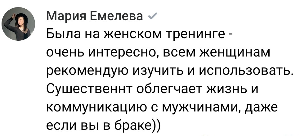 Сейчас я точно знаю, что делала не так, и как сейчас исправить прежние ошибки. Тренинг научил не останавливаться , а двигаться вперед, получая от общения и новых знакомств положительные эмоции, научил лучше разбираться в мужчинах, их мыслях.